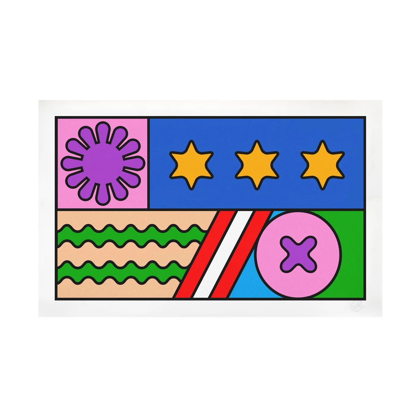 Layers of colour, rhythm and geometry collide to form a composition that feels civic yet deeply personal — a flag for everyone, and for no one. Each print captures the energy of the original installation while standing alone as a statement about pride, complexity and human connection.