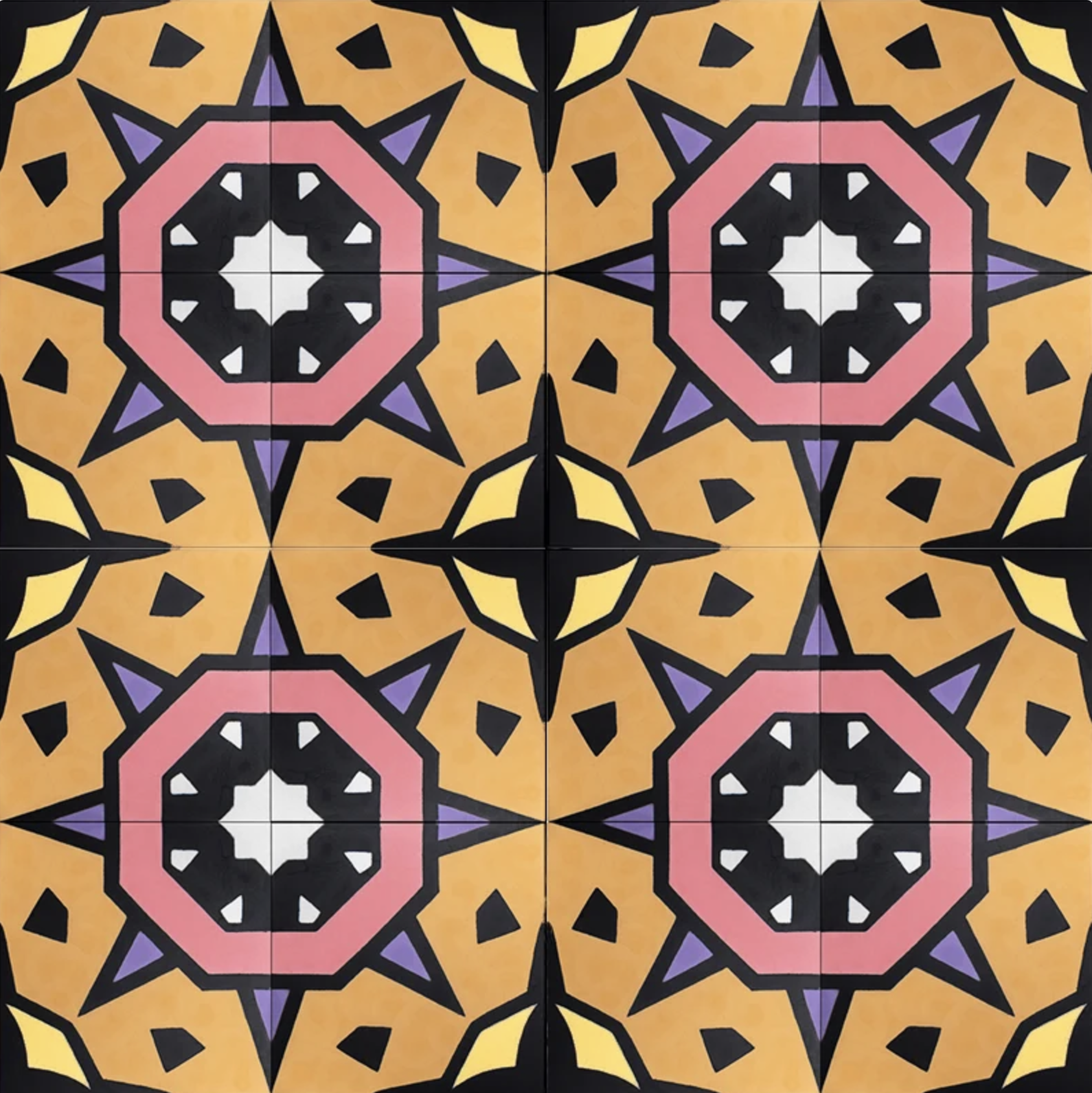 Custom encaustic cement tiles handmade in Morocco by hand-pouring a cement mix into a metal divider form, resulting in natural variations in the definition of lines, patterns, and colour.